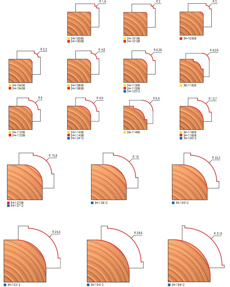 Концевые фрезы с напаянными твердосплавными пластинами используются для снятия свесов кромки под необходимый радиус закругления. Обгонная фреза имеет нижний подшипник, равный диаметру фрезы. Фрезы предназначены для снятия радиусной фаски в ПВХ, МДФ и ДСтП, древесины твердых и мягких пород. Высокое качество металла хвостовика гарантирует высокую точность и чистоту обработки. Твердосплавная напайка высокого качества, в сочетании с высоким качеством припоя обеспечивает долгий срок службы инструмента. Используются фрезы как на ручных фрезерах, так и на станках с ЧПУ.