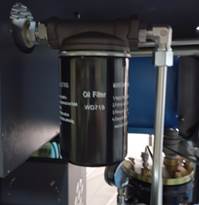 | Масляный фильтр Прежде чем попасть в винтовой блок из сепаратора масляного бака масло проходит через масляный фильтр ,где происходит удаление металлических частиц в смазочном масле ,что уменьшает износ подшипников и роторов винтового блока. |