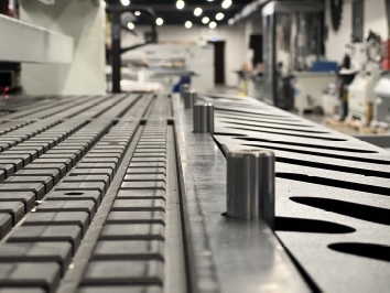 УСИЛЕННАЯ КОНСТРУКЦИЯ ОПОР ПОРТАЛА Портал установлен на стальные опоры, увеличивающие жесткость конструкции портала, а также повышающие устойчивость к деформациям. Увеличенная базовая опорная площадка фиксируется за счет 8 болтов и имеет специальные ребра жесткости, что позволяет значительно увеличить нагрузочные показатели станка, без потери качества обработки.