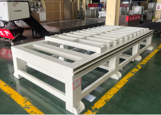 Цельносварная стальная станина Станина станка выполнена на базе усиленной рамной конструкции из прямоугольных стальных труб, что обеспечивает высокую жёсткость и устойчивость к статическим и динамическим нагрузкам. Геометрическая точность фрезерованных поверхностей под направляющие достигается за счёт обработки станины за одну установку на пятиосевых металлообрабатывающих центрах с ЧПУ, что гарантирует стабильную точность и качество при обработке. Конструкция прошла высокотемпературную термообработку для снятия внутренних напряжений, возникающих после сварки. Общая длина станка — 4,3 м, масса — 3,5 тонны , что является внушительным показателем для данного класса оборудования и способствует высокой устойчивости в процессе работы. |