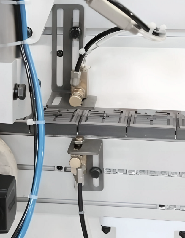 ПОДАЧА РАЗДЕЛЯЮЩЕЙ и ОЧИЩАЮЩЕЙ ЖИДКОСТИ Узел подачи разделяющей жидкости, расположен перед узлом предварительного фрезерования торца заготовки и предназначен предотвратить налипания клея на поверхность панели. 2 форсунки одновременно наносят жидкость сверху и снизу заготовки. Регулировка подачи необходимого количества жидкости. Улучшает обработку детали на последующих узлах. |