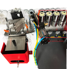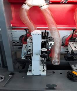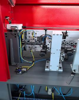 ПРЕСС ГРУППА · Состоит из одного подающего ролика большого диаметра O 100 мм и трех до прессовочных O 65 мм роликов обеспечивая надежную фиксацию кромочного материала на торец заготовки. · Регулировка площадки прижимной группы на толщину кромочного материала осуществляется с помощью цифрового счетчика. · Каждый ролик оснащен индивидуальным пневмоцилиндром. · Прижимные ролики подходят для прижатия кромочного материала различной толщины на торец заготовки для минимизации клеевого шва. |