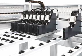 | ТОЛКАТЕЛЬ И ЗАЖИМЫ Мощный толкатель предназначен для точного и быстрого позиционирования плит ДСтП. Толкатель оснащен 13 триннадцатью (зажимами). Они обеспечивают прочный захват пакета ДСтП. Захваты позволяют выталкивать стопку раскроенных плит за линию раскроя, что облегчает их перемещение и выгрузку. Толкатель в процессе раскроя передвигает пакет плит по оснащенным роликами специальным направляющим, которые предназначены для защиты поверхности облицованной плиты ДСтП от царапин и сколов. Толкатель приводится в действие бесщеточным сервомотором PANASONIC. Перемещение толкателя задается непосредственно системой ЧПУ. |