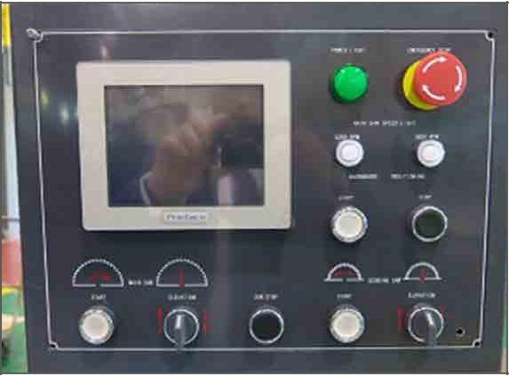 ПУЛЬТ УПРАВЛЕНИЯ НА СТАНИНЕ Пульт управления станком позволяет оператору быстро включить/выключить привод пил, а также настроить угол наклона и вылет основной и подрезной пилы, которые регулируются при помощи электромоторов. На панели установлен индикатор частоты вращения основной пилы а также кнопка аварийной остановки станка. Наклон пильного узла в пределах от +45º до +90º осуществляется за счет электропривода. Угол наклона отображается на электронном табло с точностью до 1º. |
