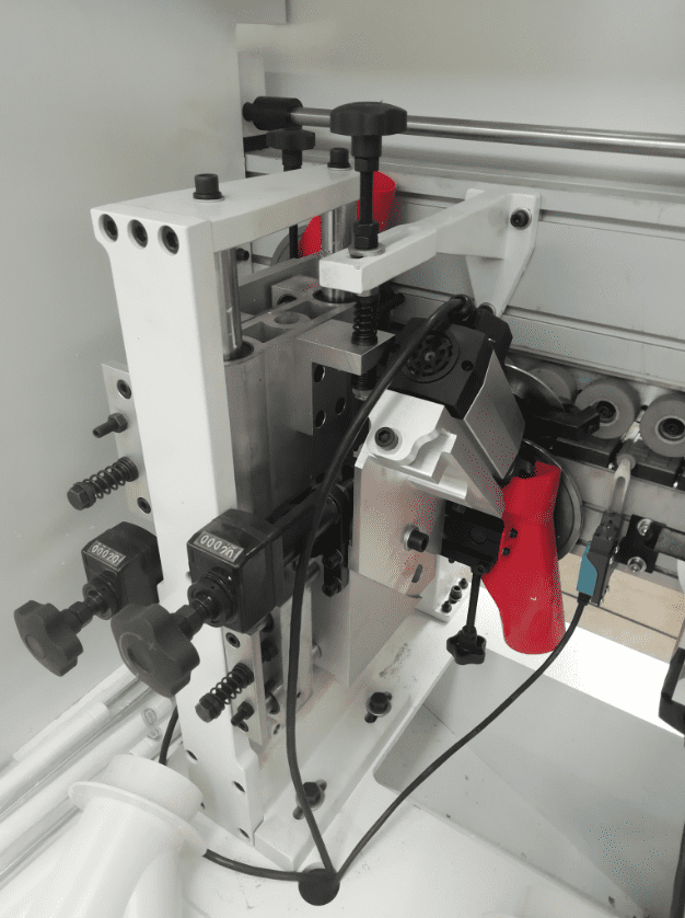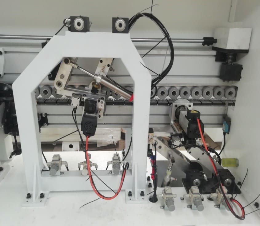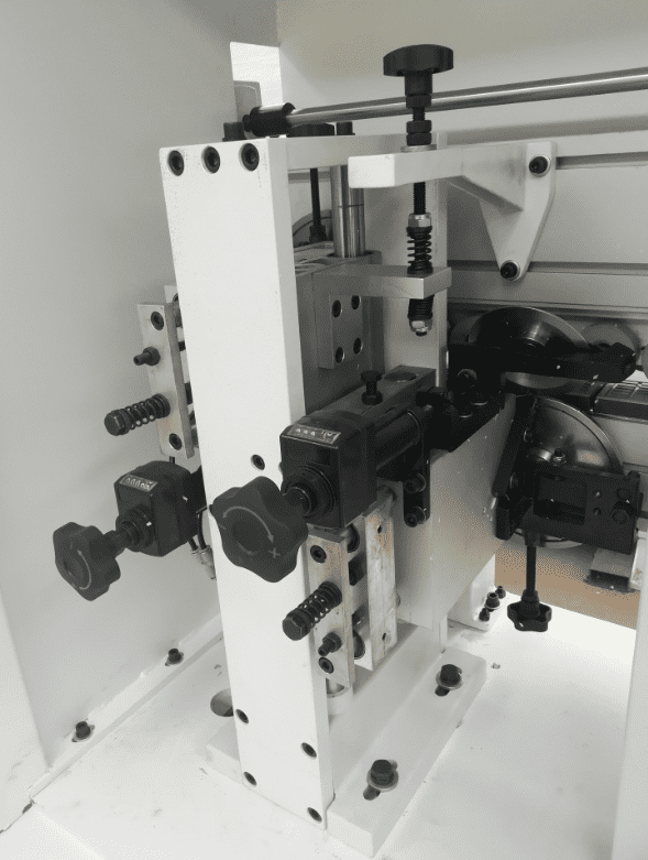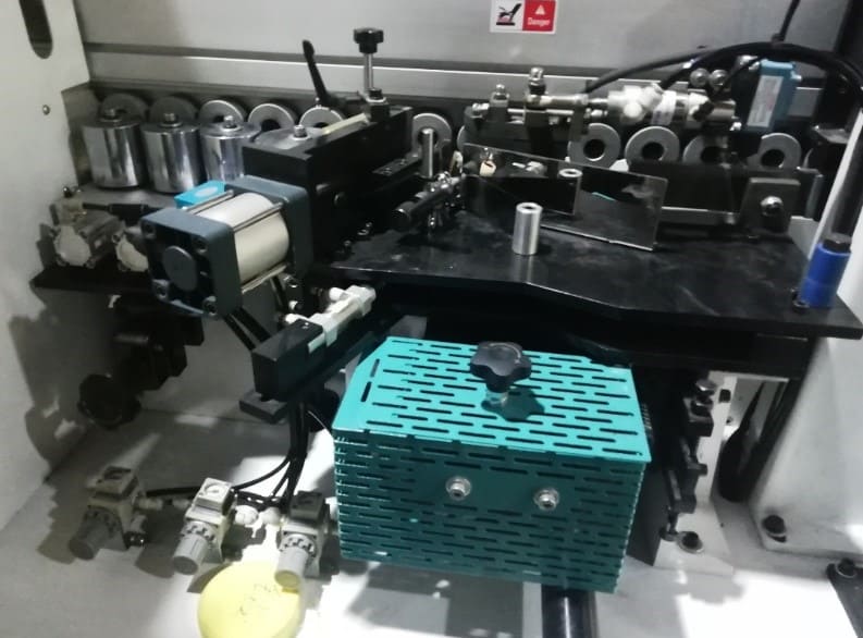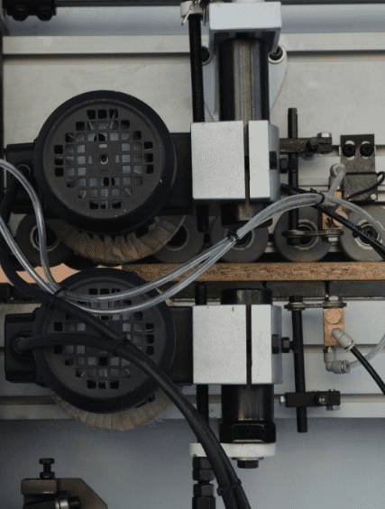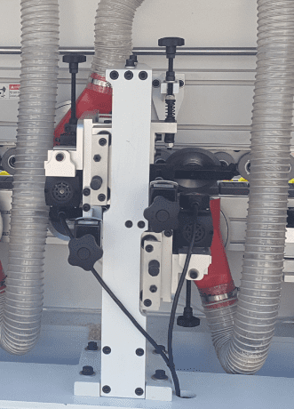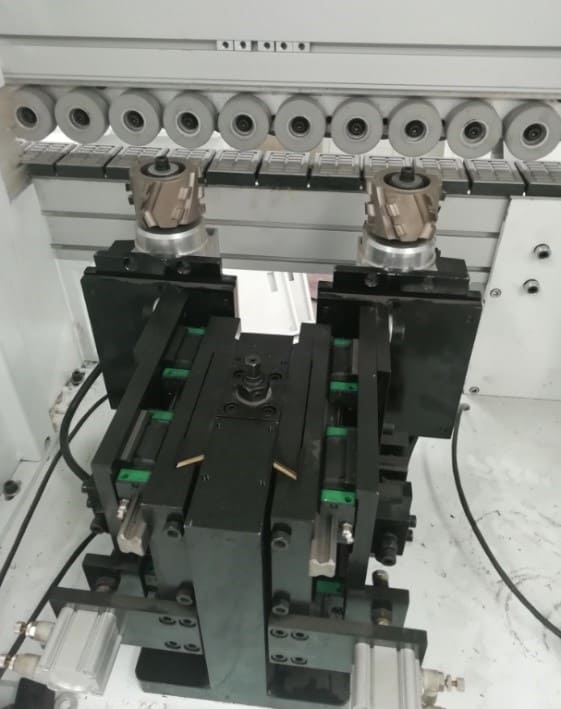 2-УХ МОТОРНАЯ ОБКАТКА УГЛОВ Узел предназначен для профильного фрезерования передних и задних стыков кромки (углов). 2 двигателя обкатки углов: Мощность: 0,37 кВт; Частота: 200 Гц; Скорость вращения: 12 000 об/мин. Две фрезы с алмазными напайками Ø70 х Ø16 H16 Z3. Движение за счет пневматических цилиндров. Возможно выбрать индивидуальную обработку угла стыков кромки. Узел..обкатки..регулируется автоматически с помощью электро-датчика.