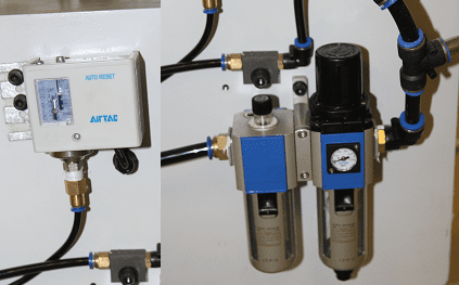 БЛОК ПОДГОТОВКИ ВОЗДУХА Пневмо-система станка оснащена блоком AirTAC. Регулировка давления и точный контроль подачи воздуха. Состоит из резервуара с маслом для смазки системы масляным туманом, фильтра тонкой очистки и блока контроля распределения. Необходимое давление 8 bar.