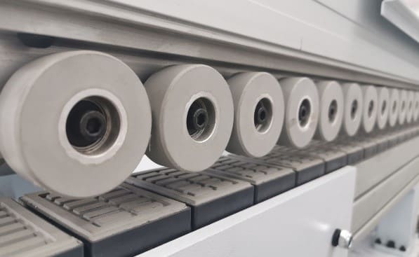 КОНВЕЙЕР Долговечная и надежная конструкция конвейера. Точное перемещение башмаков осуществляется за счет полукруглой направляющей прошедшую специальную термообработку с помощью цепи. Износостойкие башмаки в сочетании с резиновыми прижимными роликами диаметром 60 мм расположенными в 2 ряда обеспечивают точную транспортировку заготовок. Стабильная работа транспортировочного двигателя обеспечивается за счет плавного пуска и эклектического тормоза, в целях безопасности при аварийной остановке.. Двигатель подачи конвейера: Мощность: 2,2 кВт; Частота: 50 Гц; Скорость вращения: 1430 об/мин |