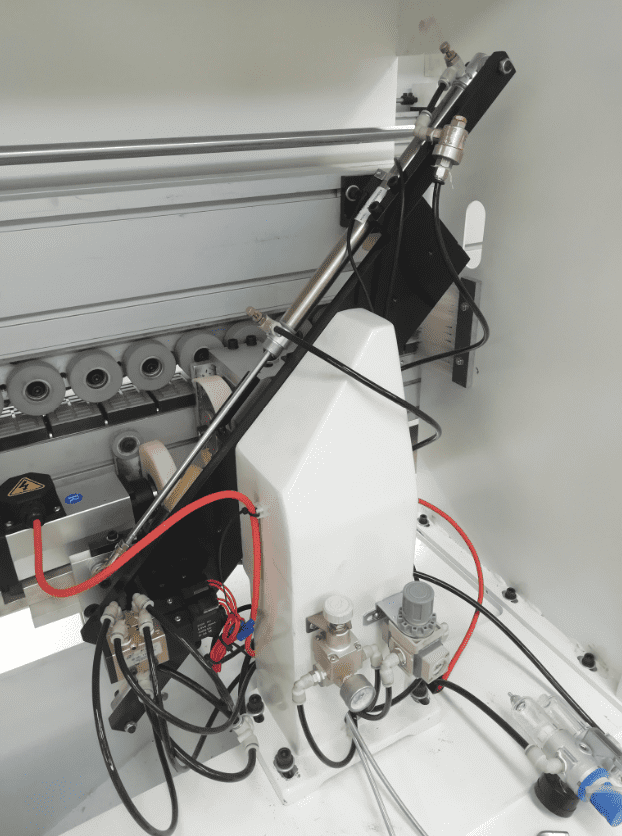 Традиционная клеевая ванна Плавная подача кромочного рулонного материала в зону нанесения клея из магазина Ø740 мм. Традиционный способ добавления клея в клеевой бачек, расположен ниже относительно клее наносящего вала. Клеевой бачок имеет тефлоновое покрытие, которое предотвращает пригорание клея к стенкам бачка. Бачок предназначен для горячего клей-расплава EVA с емкостью около 4 л. Чувствительная регулировка подачи клея, для того чтобы обеспечить рациональное использование клея. Двигатель привода подачи кромки, клеевого вала и большого прижимного ролика: Мощность: 0,75 кВт; Частота: 50 Гц; Скорость вращения: 1400 об/мин. |