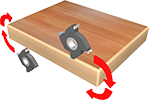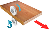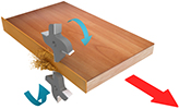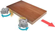 ФРЕЗЕРОВАНИЕ СВЕСОВ (Черновое) Служит для фрезерования верхних и нижних свесов заготовки. Узел фрезерования свесов с 2-мя двигателями: Мощность: 0,75 кВт; Частота: 200 Гц; Скорость вращения: 12 000 об/мин. Точность позиционирования заготовки за счет копиров большого диаметра 180 мм по плоскости с верху и с низу, а также круглых конусных копиров Ø120 мм в торец заготовки. На каждом двигателе установлены фрезы R2 Ø69 х Ø16 H13 Z4. Система аспирации эффективно убирает стружку из зоны обработки. Чистое пространство во фрезерном узле обеспечивает высокое качество обработки